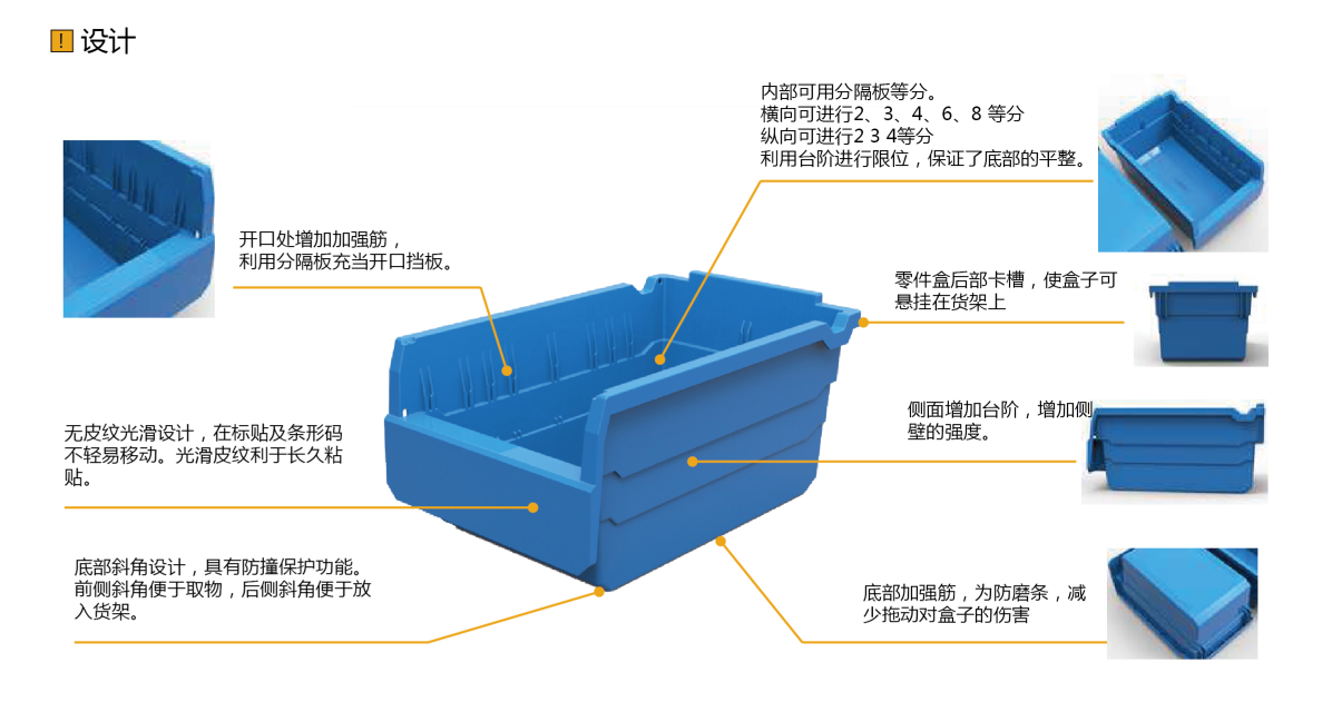 2. 人机交互:实现抽屉般抽拉与悬挂,符合大众使用习惯,扣手舒适,存取物方便;盒子前端可贴标识、二维码等,便于辨认,可实现快捷存取物品;该系列产品颜色选择性强,每款产品分别有红、黄、蓝、绿、白及半透明六种效果,可实现物料的目视化分类管理。